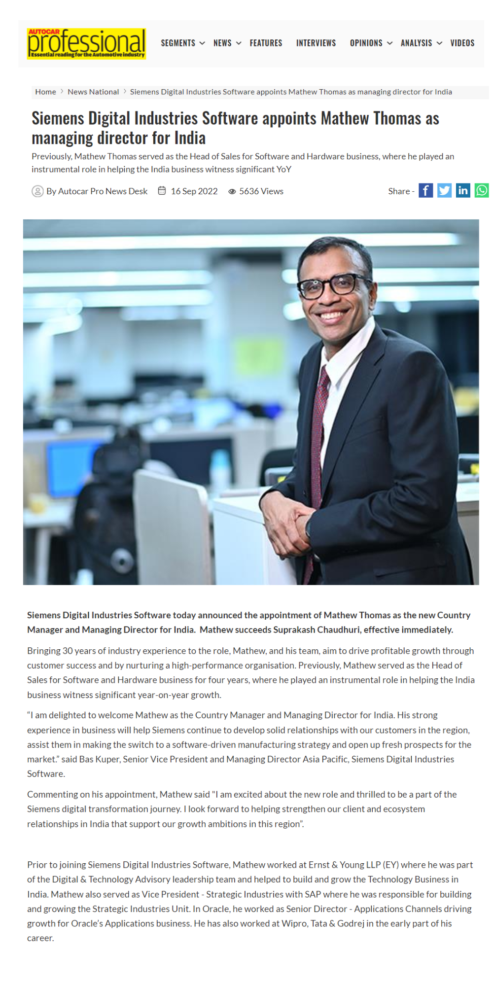 Siemens Digital Industries Software appoints Mathew Thomas as managing director for India